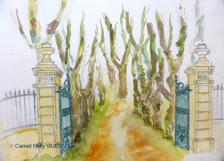 Aquarelle en cours de Nelly : la grande allée de platanes du parc, espace de respiration où nous étions hébergés.