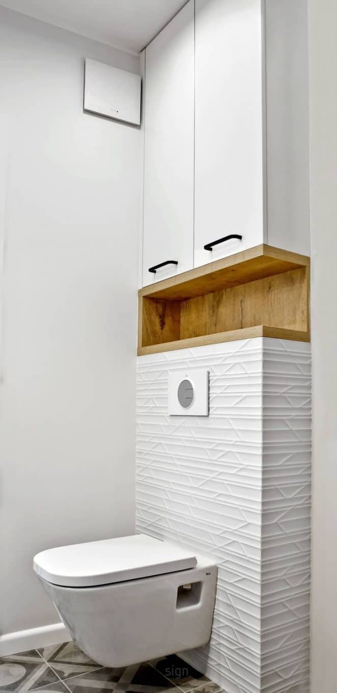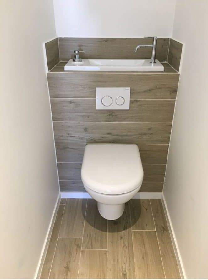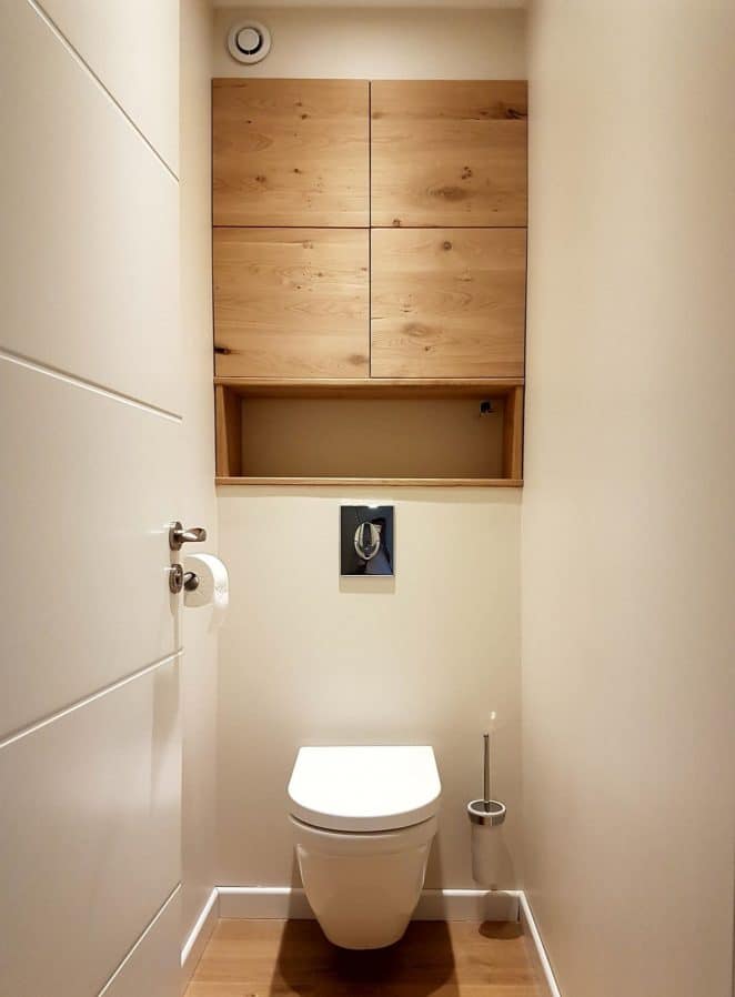 L’étagère en bois clair, nichée dans le mur, apporte une touche très naturelle. La preuve que l’esprit bois s’accorde parfaitement avec l’ambiance épurée des toilettes, pas seulement dans le salon.