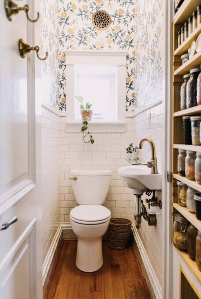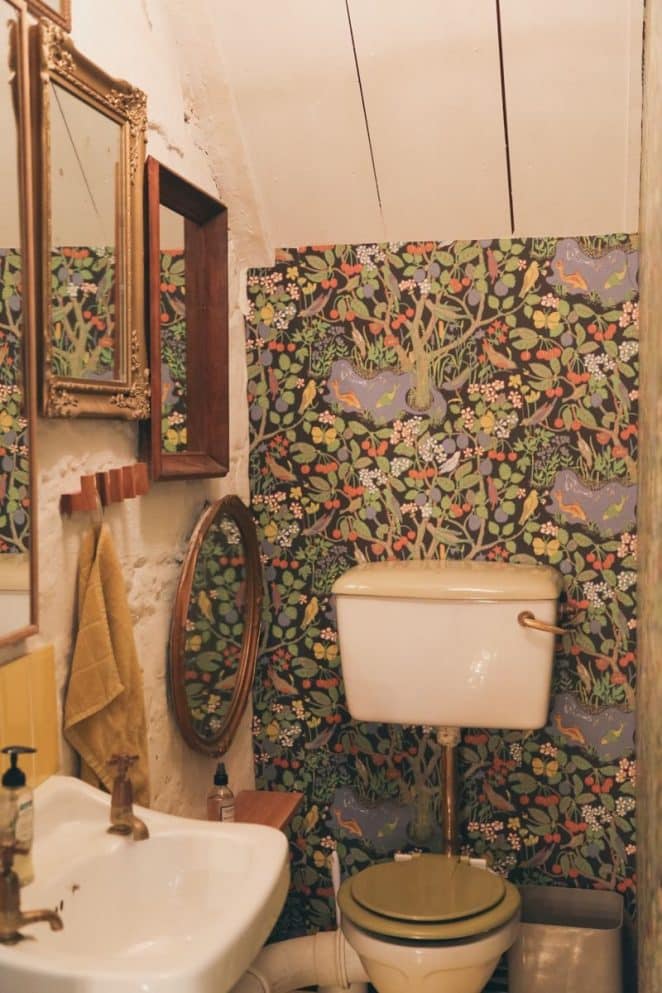 Lambris blancs, papier peint bucolique, miroirs anciens et évier Art Déco : tout invite à la poésie dans ce petit espace.