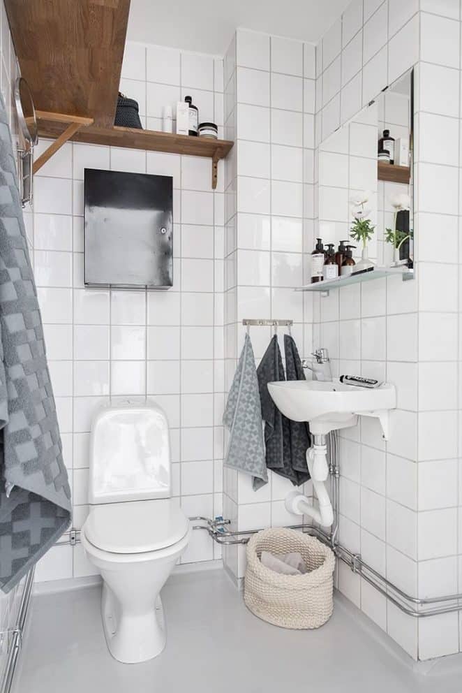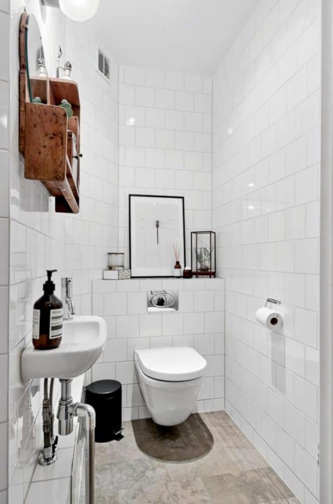 Avec des joints ultra-fins, le carrelage blanc purifie visuellement l’espace. Quelques objets déco suffisent à personnaliser la pièce.