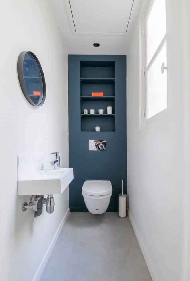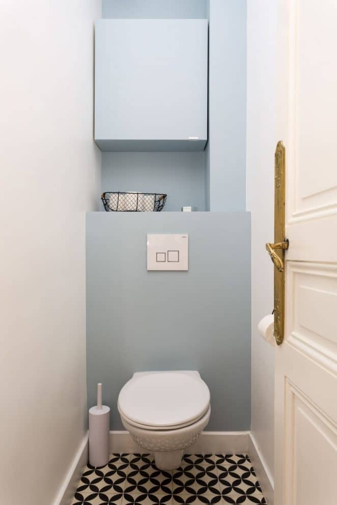 Le bleu pastel adoucit l’ambiance. Malgré l’exiguïté, ces toilettes offrent un espace de rangement optimisé et une niche bien pensée.