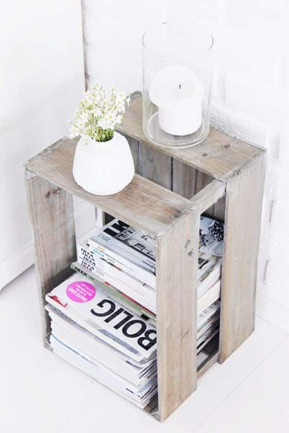 Une simple caisse en bois, posée à la verticale, se transforme en porte-magazines pratique et déco.