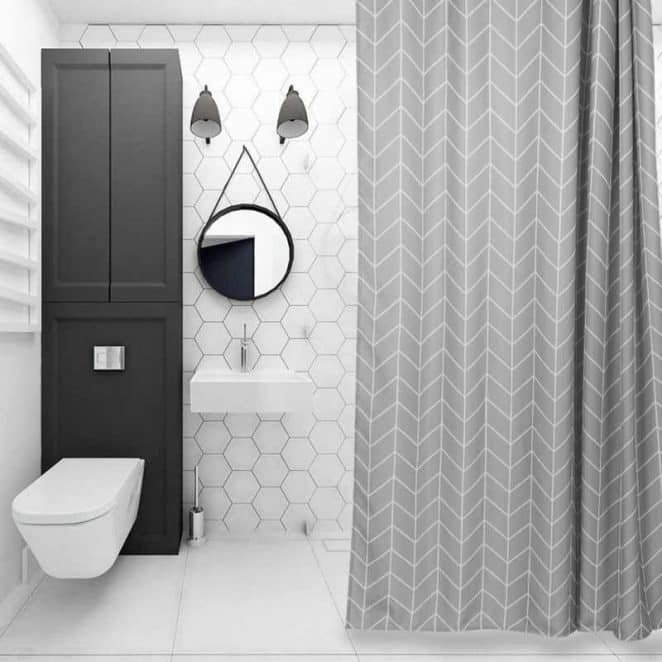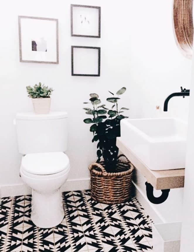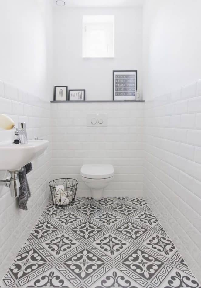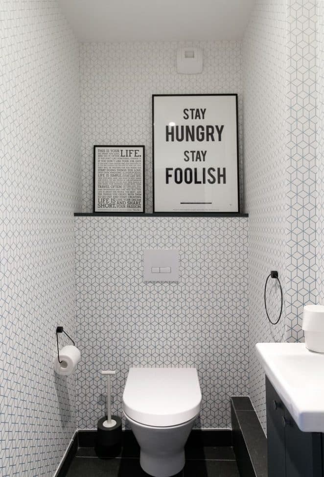 Un sol graphique noir et blanc dynamise des toilettes entièrement blanches, leur apportant éclat et originalité.
