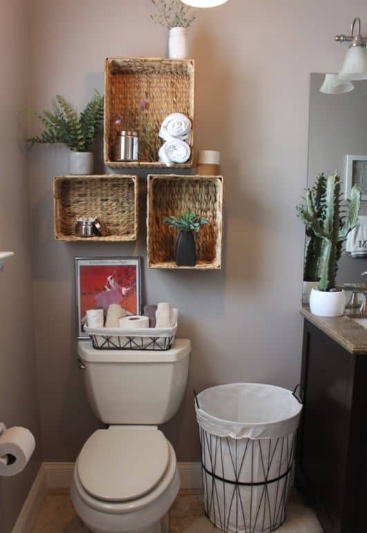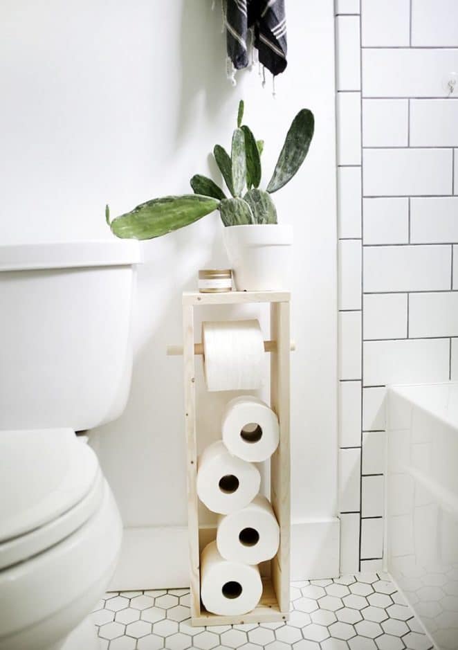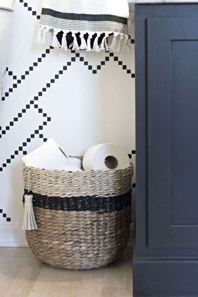 Si l’espace le permet, un panier posé au sol devient le rangement idéal pour les rouleaux de papier toilette.