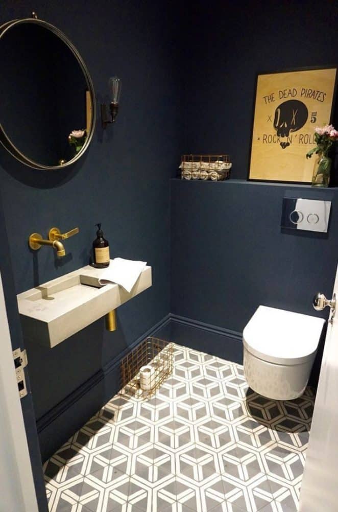 Bleu et noir s’entrelacent sur des carreaux géométriques, recouvrant sol et mur. Pour un effet encore plus harmonieux, peignez les autres cloisons dans les mêmes tons.
