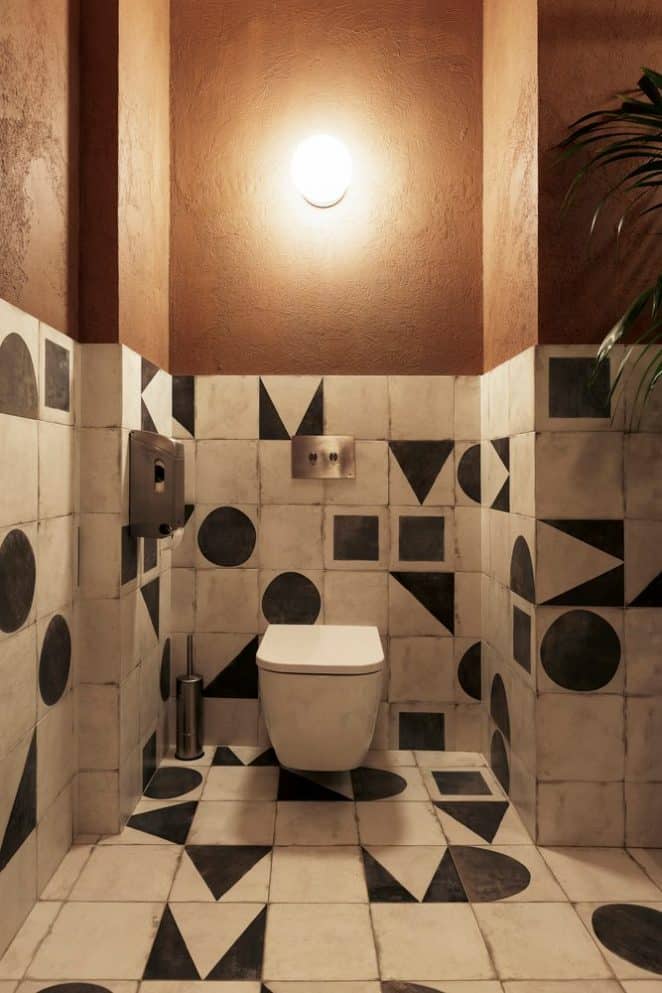 Des carreaux de ciment géométriques disposés au sol et au mur créent un effet visuel hypnotisant dans une pièce biscornue.