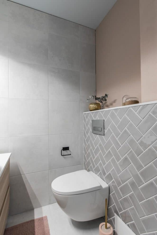 Le rose pastel, très en vogue, s’affiche au mur, au sol ou via les accessoires. Il adoucit l’atmosphère, que l’on soit en cuisine ou aux toilettes.