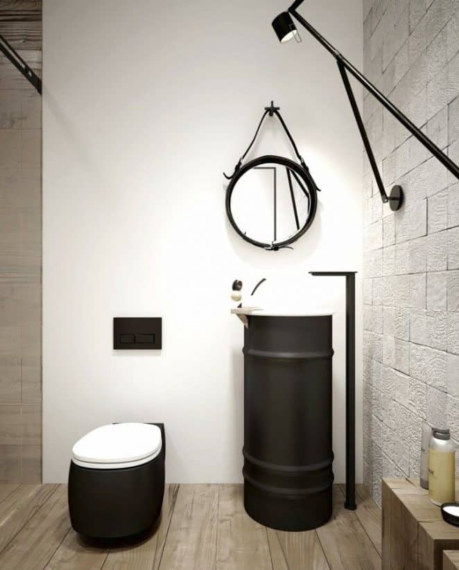 Quand le manque de place impose, l’armoire à pharmacie trouve naturellement sa place dans les toilettes. Le métal noir complète un décor minimaliste.