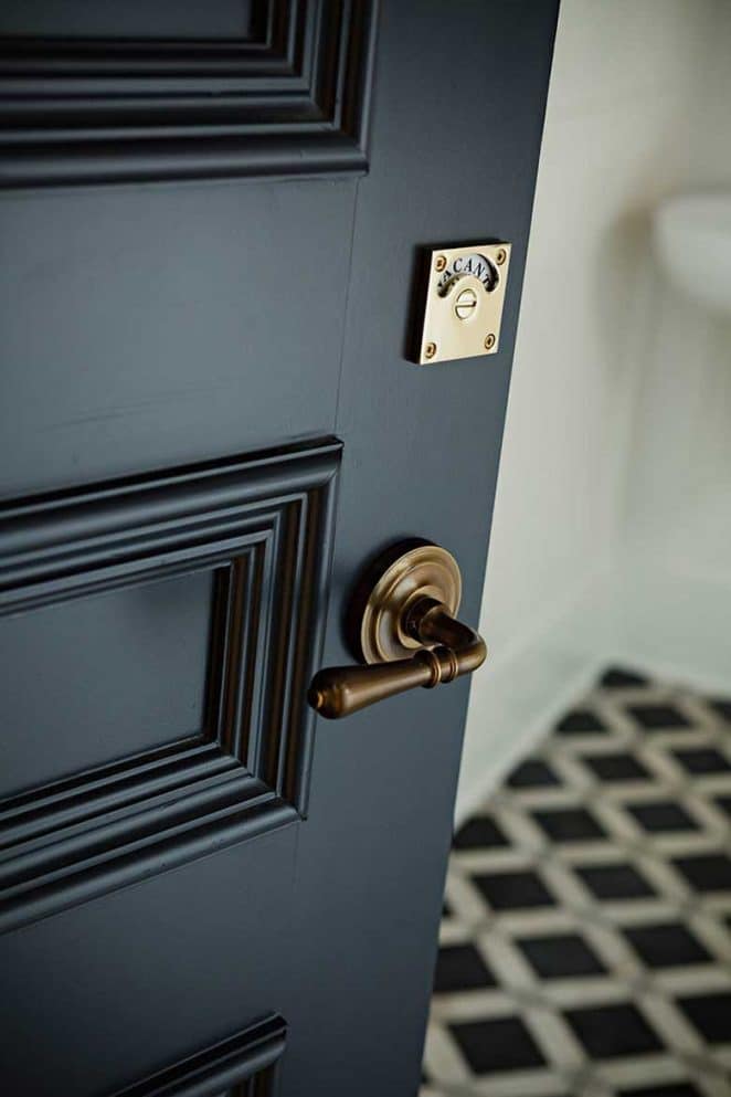 Sur une porte bleu profond, un indicateur « vacant, occupé » en laiton apporte une note rétro, façon restaurant branché.