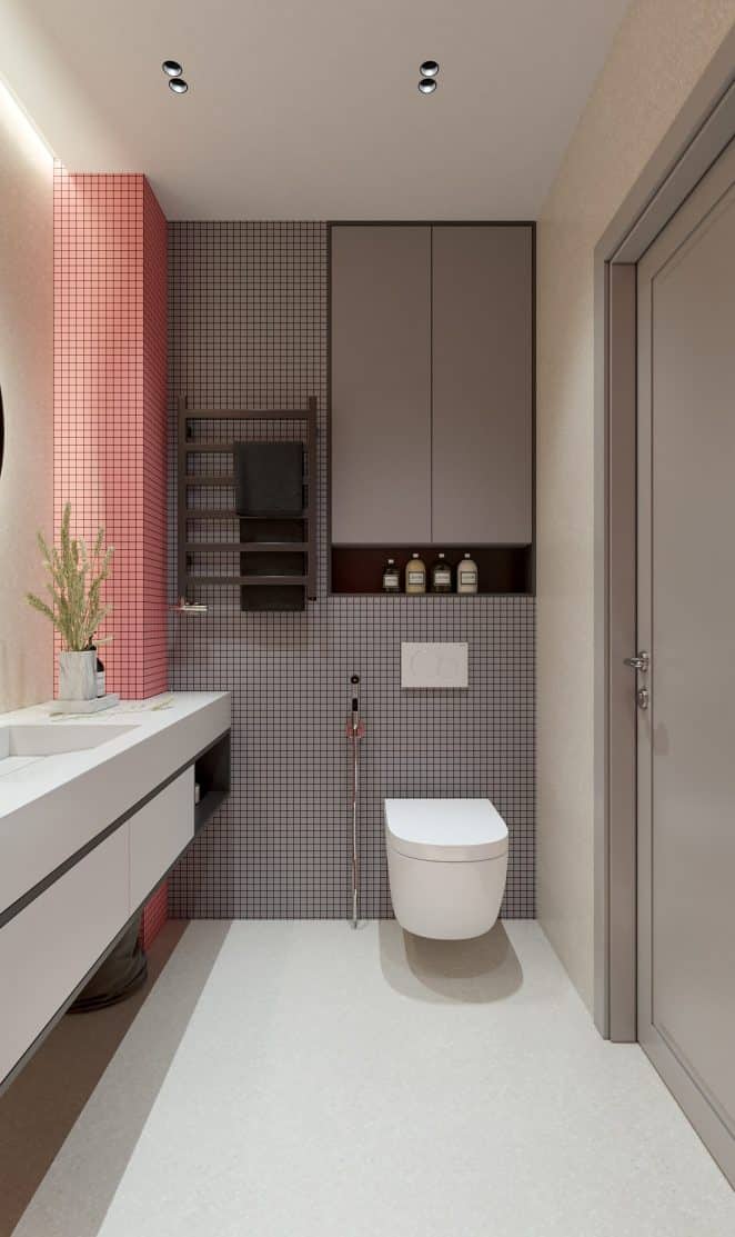Rose tendre et gris souris s’associent sur des mosaïques mates. Associées à des WC suspendus et à du marbre, elles cassent les codes habituels.