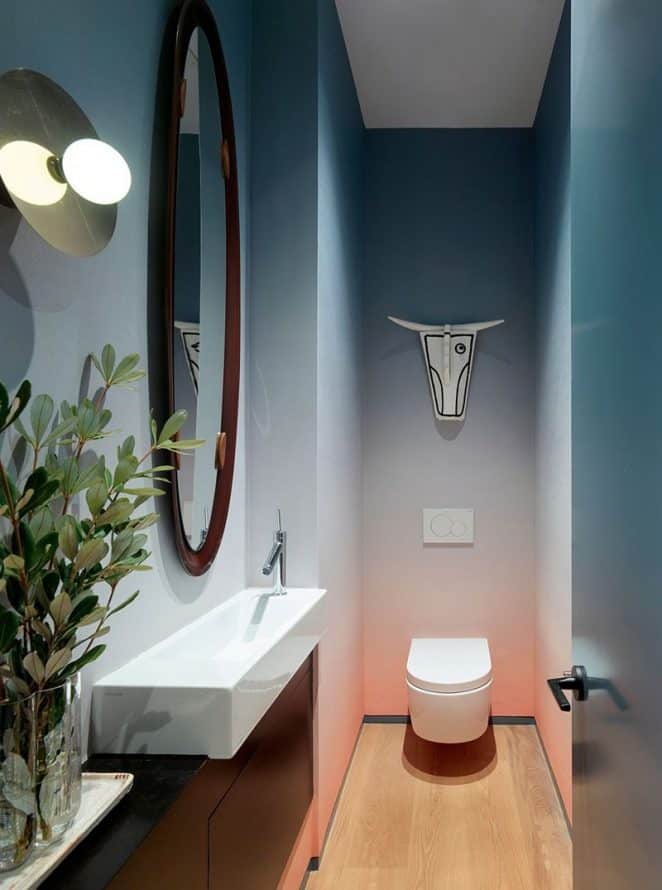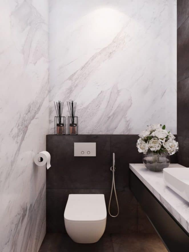 Envie d’excentricité ? Les toilettes sont l’endroit parfait pour l’assumer. Ici, ce ne sont pas des papiers peints panoramiques mais des panneaux en céramique XXL qui font vibrer les lieux.