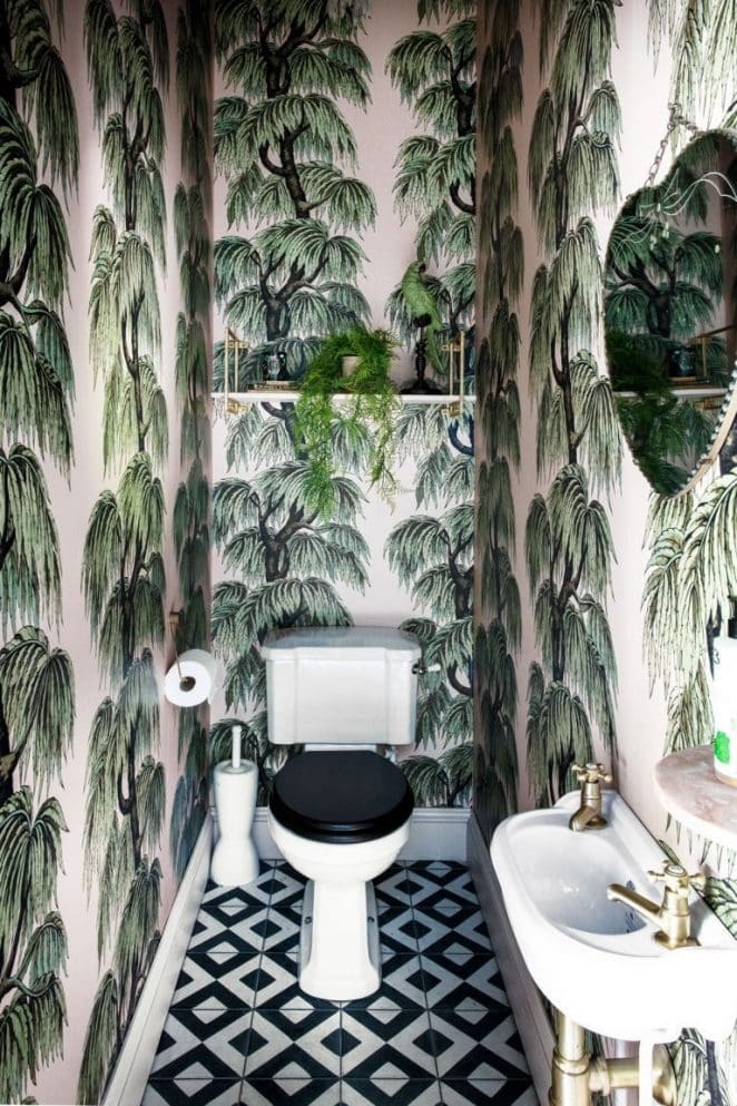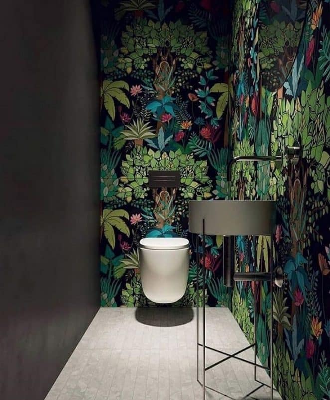 Le papier peint panoramique à motif végétal fait entrer la tendance Jungle dans les toilettes, pour une ambiance immersive.
