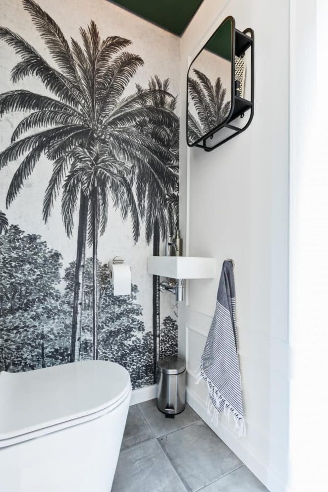 Le papier peint panoramique s’impose, même ici. Noir et blanc, il métamorphose l’espace, et la tendance jungle prend des allures chic.