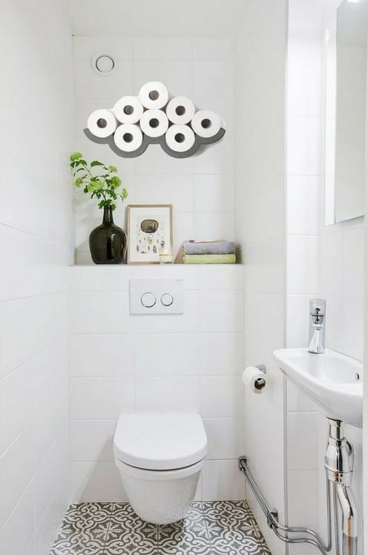 Un distributeur de papier toilette en forme de polaroid ajoute une note ludique à l’ensemble.