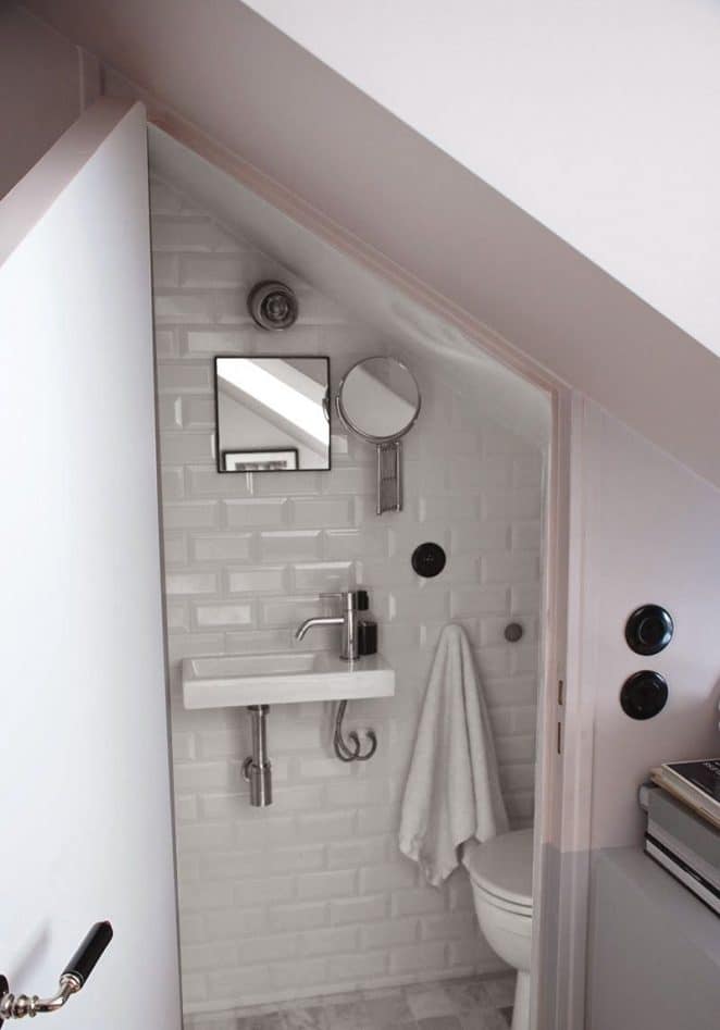 Sous les combles, tout blanc, les toilettes gagnent en luminosité et impression d’espace.