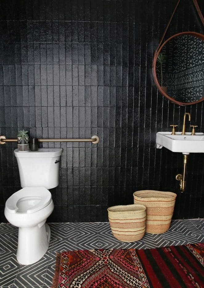 Carreaux géométriques au sol, zellige noir au mur, paniers bohèmes… le style ethnique chic s’impose naturellement.