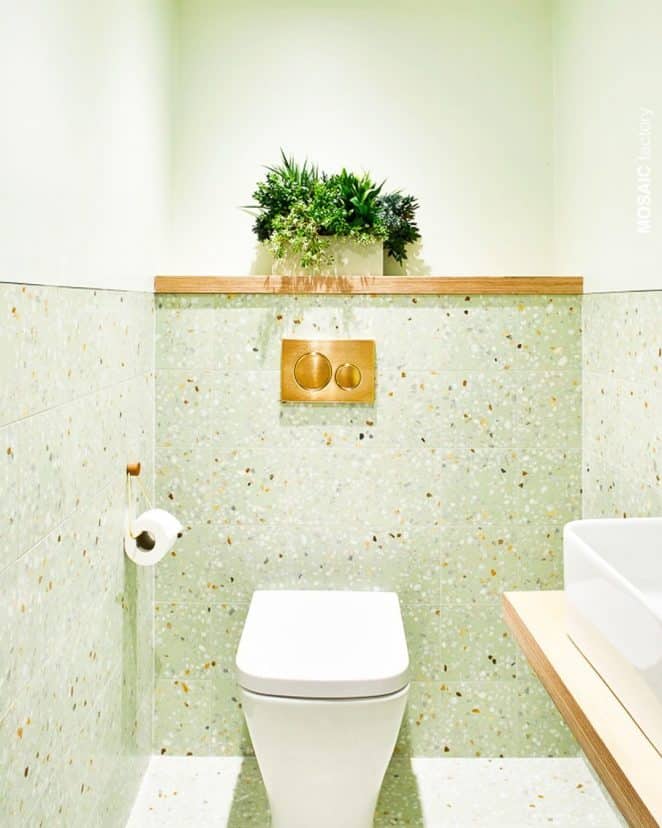 Les toilettes, véritables terrains d’expression, se mettent à la page et déclinent toutes les tendances actuelles : Urban Jungle, panoramique grand format, zellige ou terrazzo. Selon l’inspiration, elles s’habillent de chic, de minimalisme ou d’une pointe d’humour.